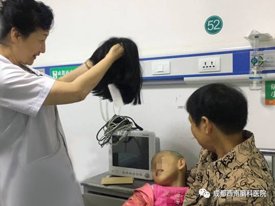 在前两天小安做完了头部手术,恢复得不错,精神状态都非常好,成都西南脑科医院考虑到他们家情况特殊,为他们减免了手术费用的50%,并且给小安送了5000的慰问金。为了让小安可以像同龄女孩子一样漂漂亮亮的出去玩,护士们还凑钱为小安买了一个假发套,小安收到这个礼物以后非常开心,奶奶看到现在的小安也欣慰不已。