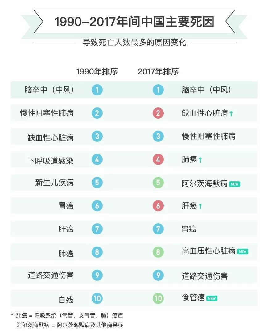 2019年6月,国际医学杂志《柳叶刀》发布了一篇重磅论文,分析了1990年~2017年,中国34个省份居民的10种主要死亡原因,结果如下: