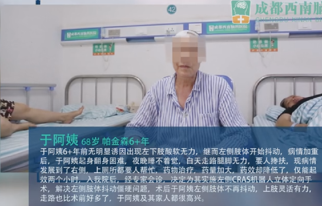 于阿姨6年前无明显诱因出现左下肢酸软无力,继而左侧肢体开始抖动,病情加重后,于阿姨起身翻身困难,夜晚睡不着觉,白天走路腿脚无力,要人搀扶,现病情发展到了右侧,上厕所都要人帮忙。